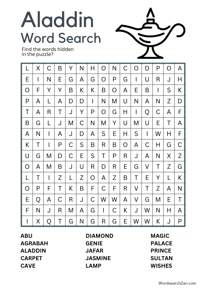 Welcome to the Aladdin Word Search! Step into the magical world of Agrabah as you search for beloved characters and terms from Disney’s “Aladdin.” From iconic names like Aladdin, Jasmine, and Genie to memorable elements like the magic carpet, this puzzle is perfect for fans of the movie. Whether you’re a child or a Disney-loving adult, this fun word search will let you relive the adventure and charm of one of Disney’s classic tales. Enjoy the search!
