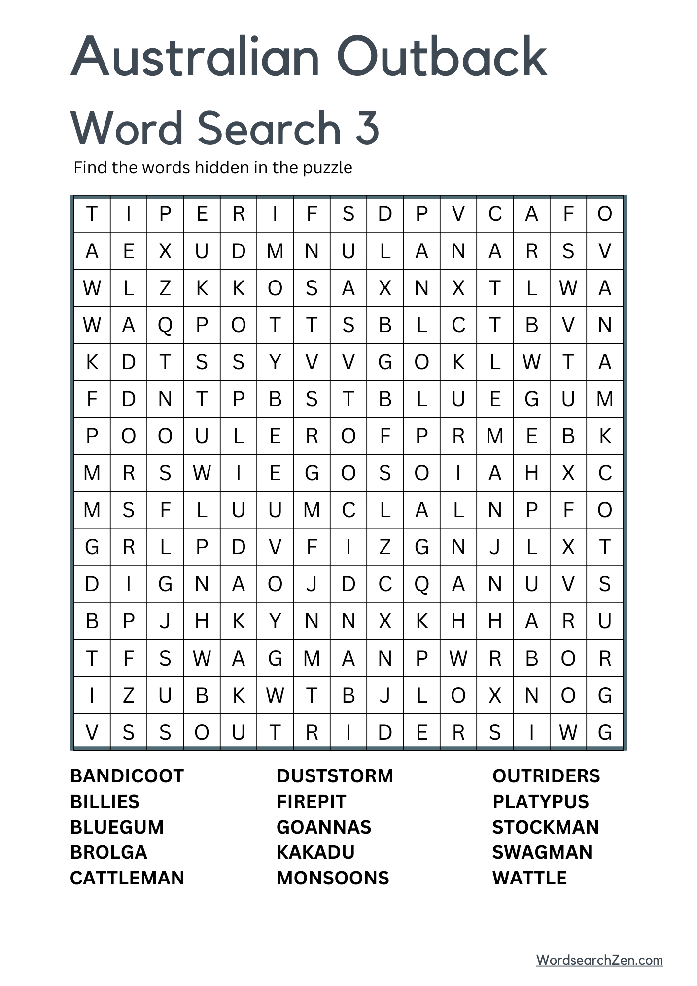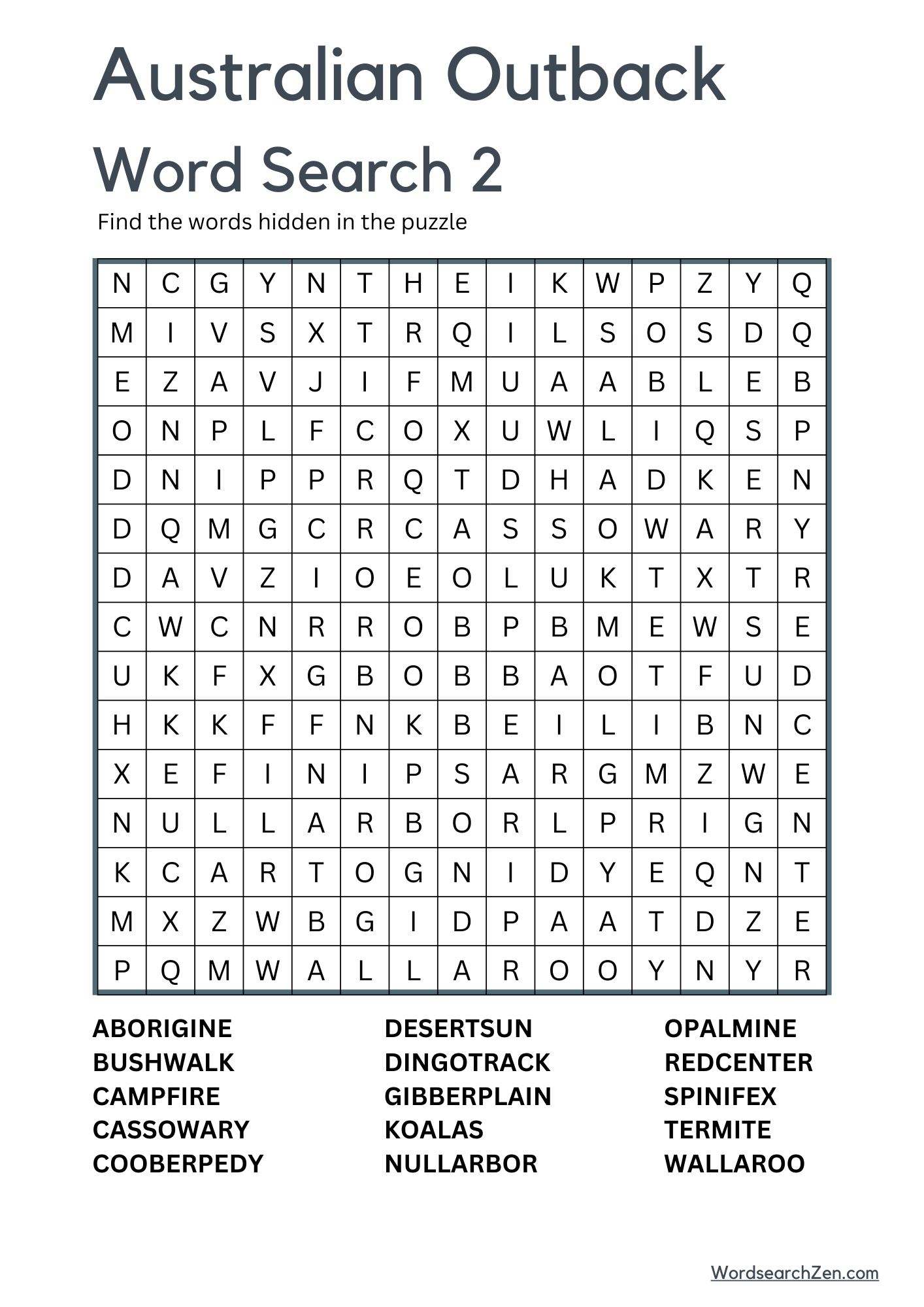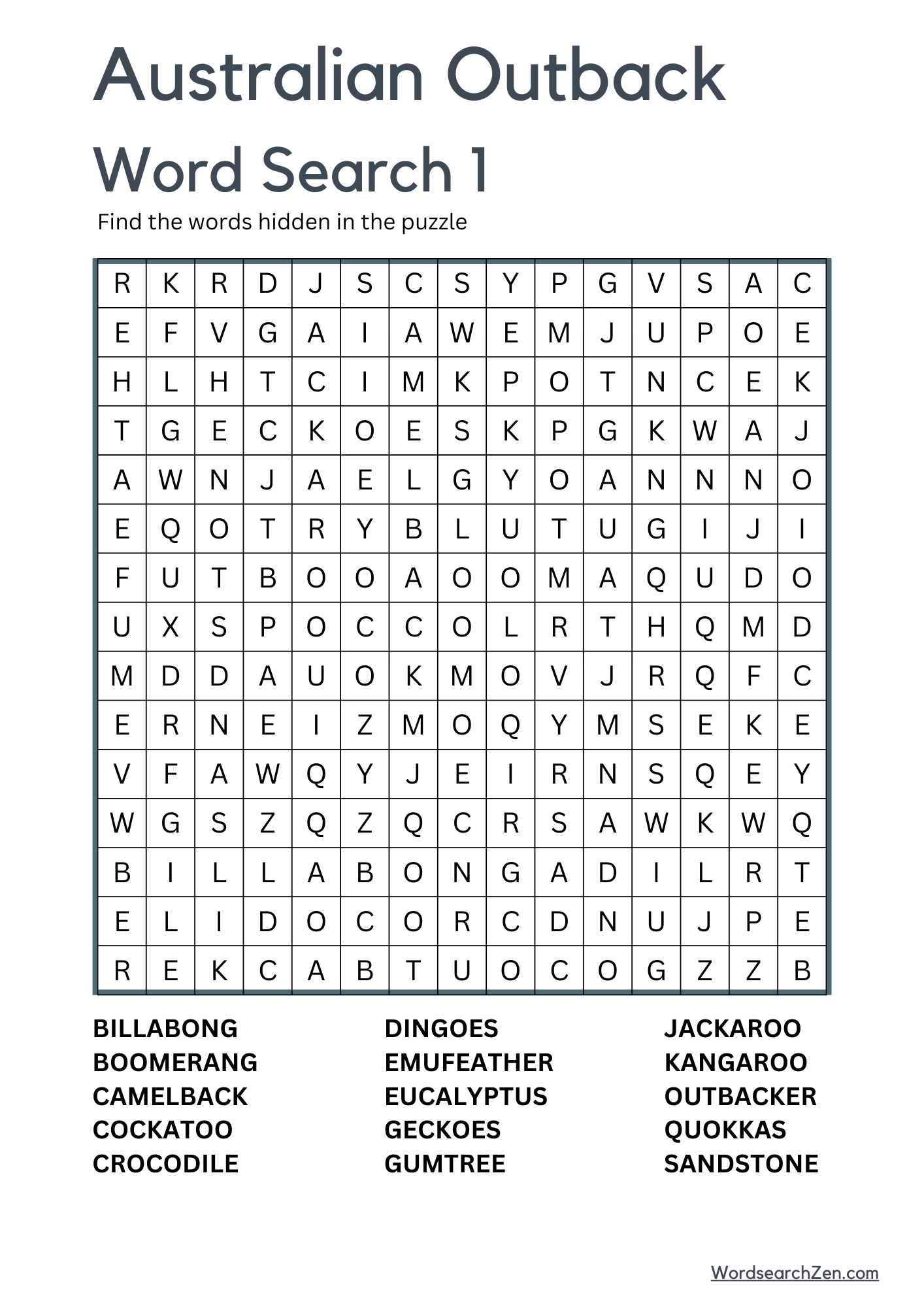 The “Australian Outback Search 5” is a word search puzzle that invites participants to explore and discover terms related to the Australian Outback. This puzzle includes keywords such as natural landmarks, native wildlife, and unique geographical features of the Outback. It offers a fun and educational way to engage with the fascinating environment of Australia’s vast interior, perfect for those who enjoy geography or nature-themed word challenges.