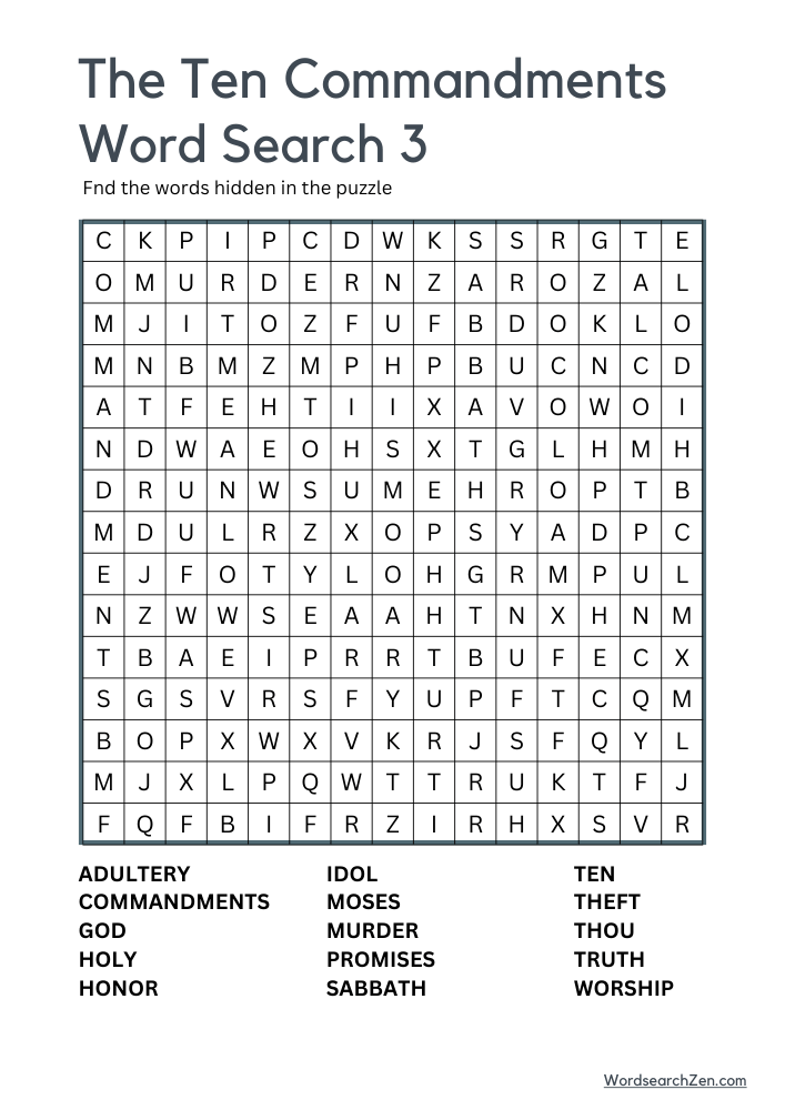 Dive into the spiritual and historical significance of the Ten Commandments with this engaging and educational word search puzzle. Featuring key terms such as “adultery,” “covet,” “dishonor,” “falsewitness,” “holy,” “idolatry,” “law,” “Moses,” “Mount Sinai,” “murder,” “obey,” “Sabbath,” “tablets,” “theft,” and “worship,” this puzzle offers a unique way to explore the foundational principles of many religious traditions. Perfect for those interested in religion, history, and moral teachings, this word search is both a challenging and enlightening activity. Whether used in a classroom setting or enjoyed during leisure time, it provides a thoughtful and mentally stimulating experience for all ages.