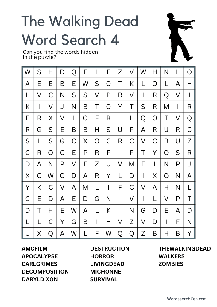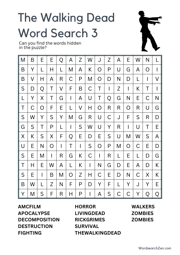 The Walking Dead Word Search is an exciting challenge for fans of the hit series, inviting you to dive into the gripping world of survival and the undead. This engaging puzzle features key terms like apocalypse, whisperer, survivor, hilltop, and zombie, providing a fun way to test your knowledge of the show’s iconic moments. Perfect for all ages, this word search is designed to entertain while you reminisce about your favorite characters and heart-pounding scenes. Whether you’re a longtime fan or new to the franchise, this puzzle is a great way to relax and immerse yourself in the thrilling universe of The Walking Dead.
