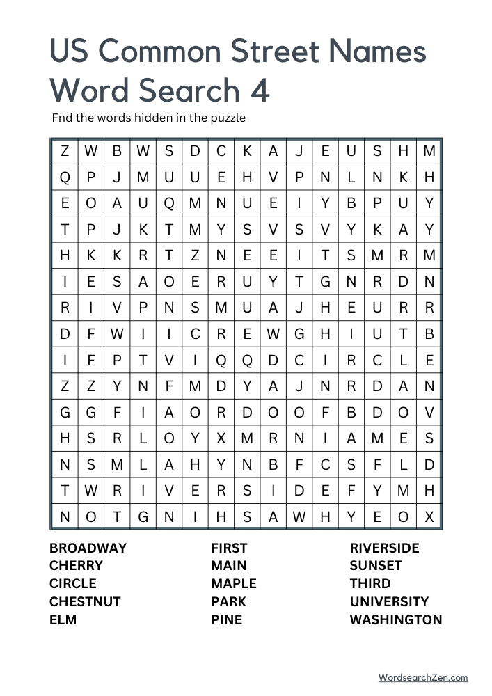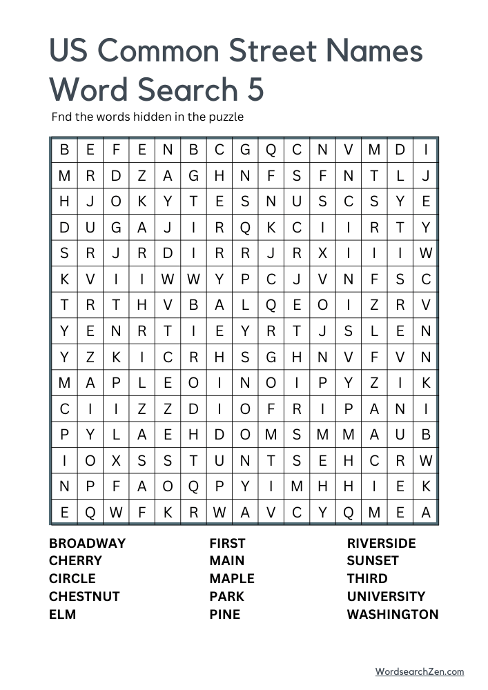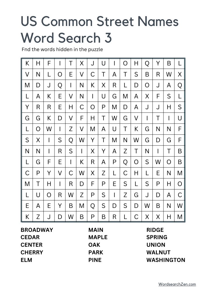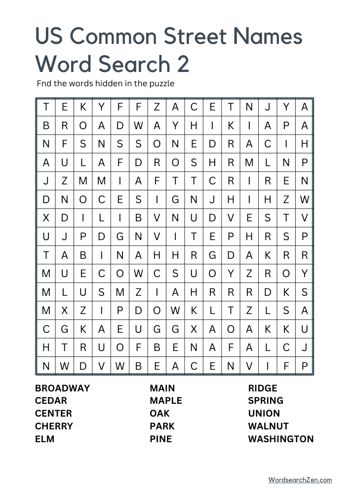 The US Common Street Names Word Search is a fun and engaging way to explore familiar street names found across the country. Featuring terms such as Broadway, Cedar, Center, Cherry, Elm, Main, Maple, Oak, Park, Pine, Ridge, Spring, Union, Walnut, and Washington, this puzzle highlights names that connect communities nationwide. Ideal for geography enthusiasts and puzzle lovers, it offers a delightful challenge while sparking curiosity about the origins of these widely used names. This activity combines entertainment with a touch of cultural discovery, making it enjoyable for people of all ages.