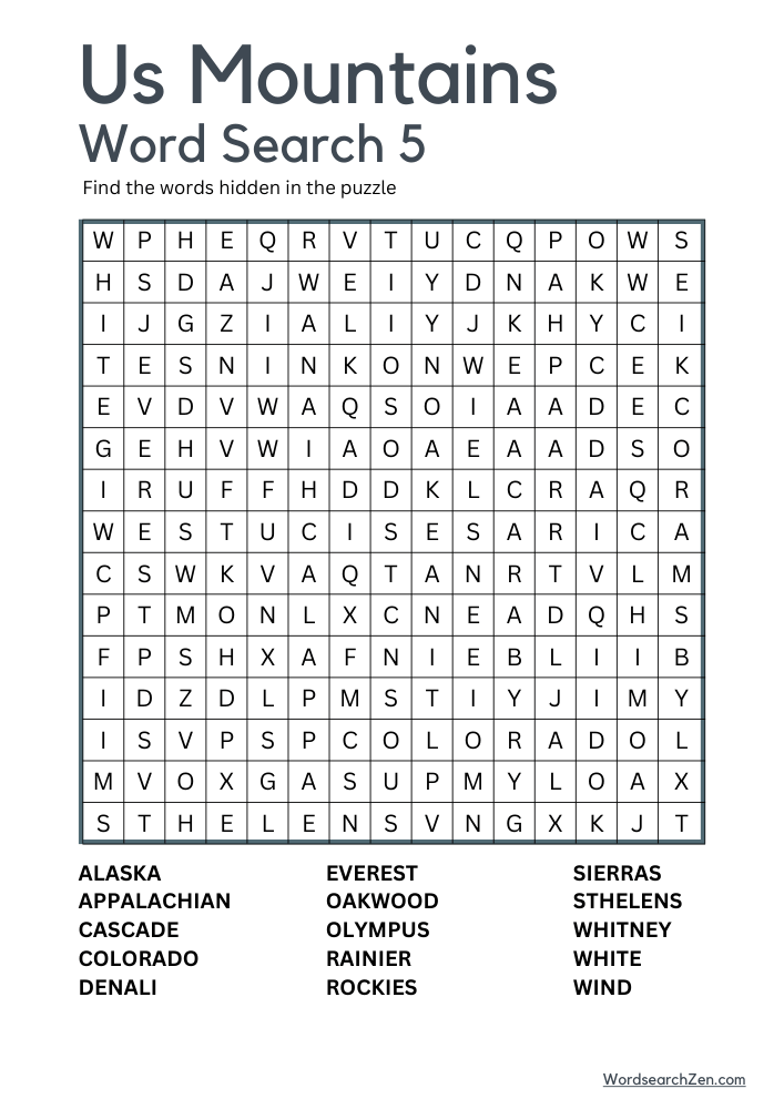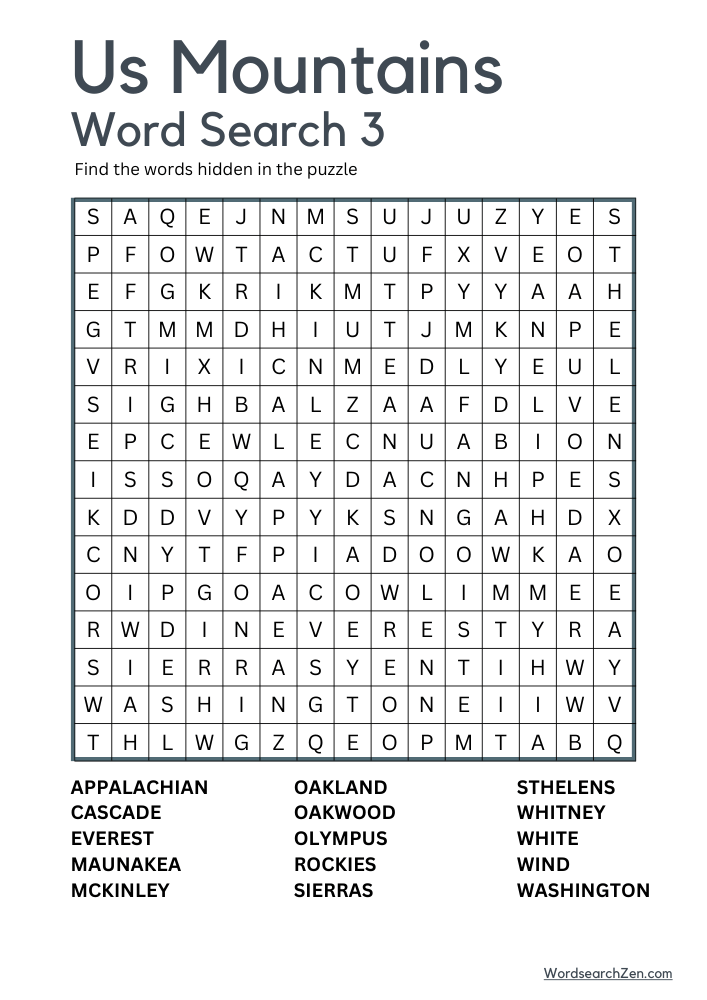 The US Mountains Word Search 76 from WordSearchZen is an educational and engaging puzzle designed for geography enthusiasts. This word search highlights notable mountain ranges and peaks across the United States, making it perfect for those interested in exploring America’s natural landscapes. Participants can search for terms like “Rockies,” “Appalachians,” “Sierra Nevada,” and “Denali,” among others. This activity serves as a fun way to enhance knowledge about U.S. geography while practicing word recognition and problem-solving skills. Ideal for classrooms, home learning, or personal enjoyment, this word search offers a blend of entertainment and educational value.