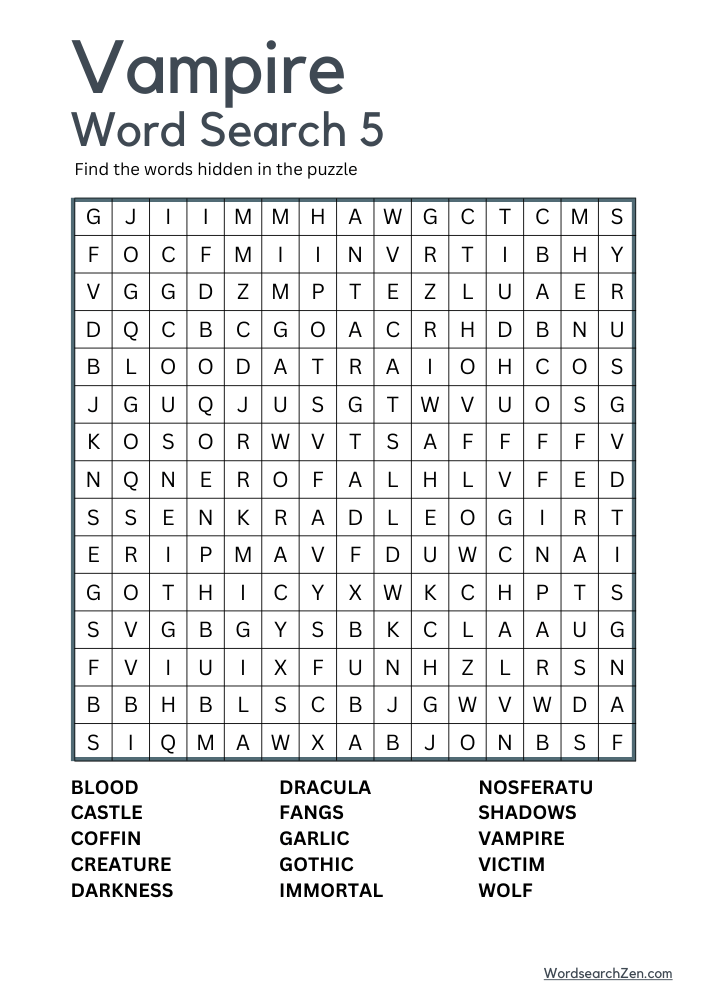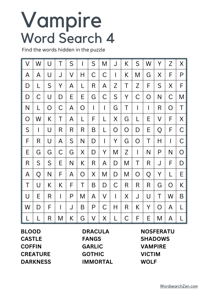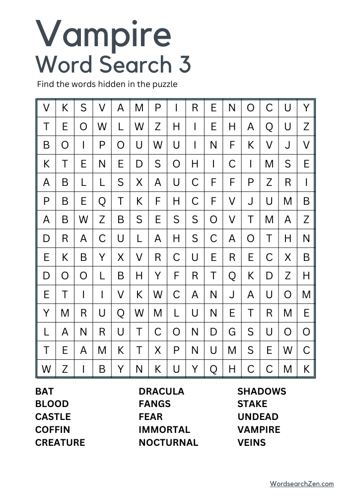 Welcome to the Vampire Word Search! Delve into the dark and mysterious world of vampires with this thrilling puzzle filled with terms like “bat,” “bite,” “blood,” and “Bram Stoker.” Perfect for fans of the supernatural and horror enthusiasts, this word search offers an engaging way to explore the lore of these immortal creatures. Challenge yourself to find words such as “coffin,” “fangs,” “garlic,” and “Transylvania” hidden within the grid. Whether you’re a seasoned vampire aficionado or just curious about the legends, this puzzle is sure to keep you entertained and captivated. Embrace the nightfall and see if you can uncover all the secrets of the undead!