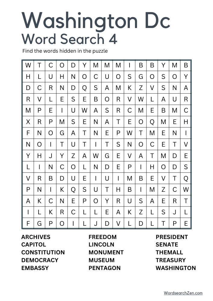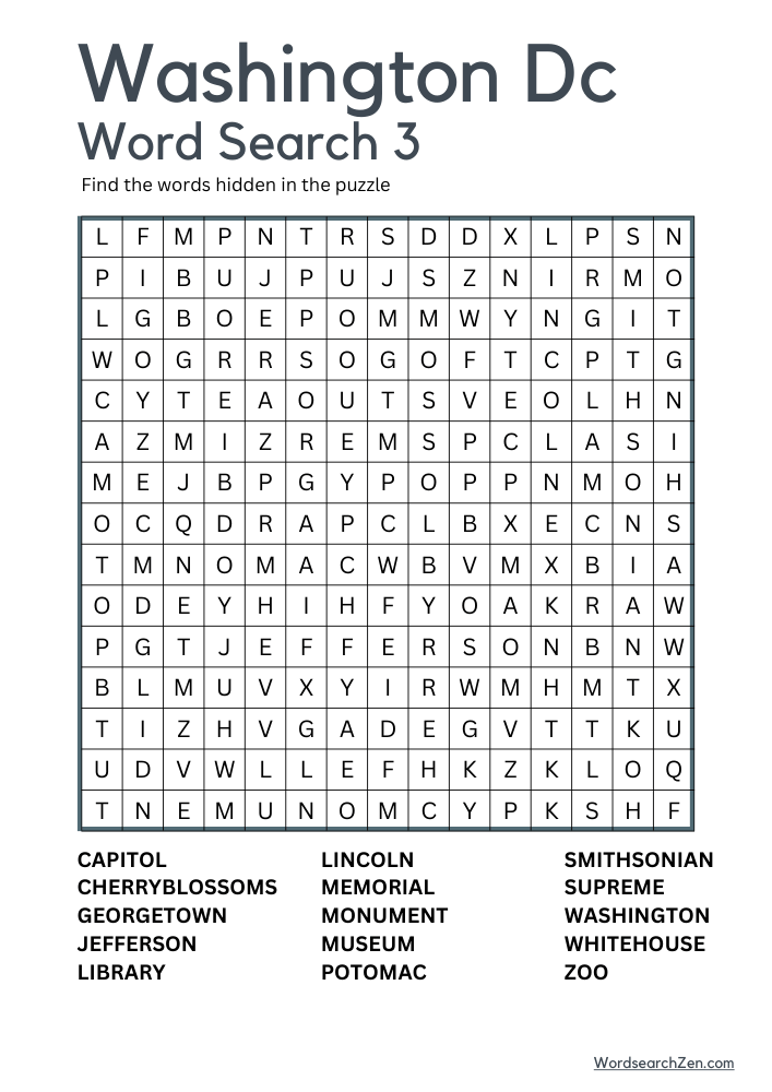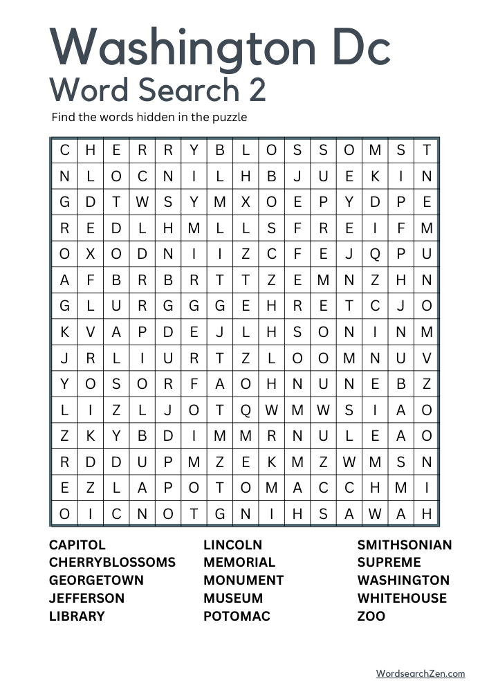 The Washington DC Word Search 79 from WordSearchZen features terms highlighting the capital’s significant landmarks and cultural points of interest. This puzzle includes words such as Capitol Hill, Lincoln Memorial, Smithsonian, White House, and Potomac, offering an educational way to explore and recognize key locations in Washington, D.C. It serves as an engaging tool for enhancing knowledge about American history and governance, suitable for students, educators, and puzzle enthusiasts.