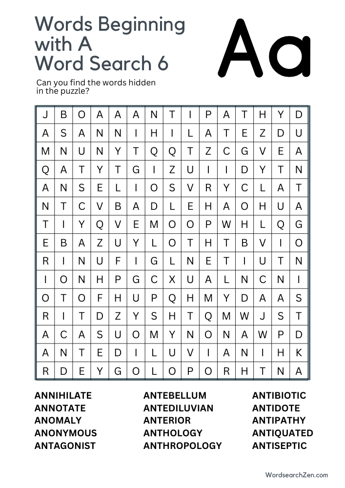 The “Words Beginning with A Word Search 3” puzzle challenges players to find a variety of words that all begin with the letter A. This fun and educational word search includes words like adroit, affable, agile, advocate, and many more, offering a mix of easy and advanced terms. Ideal for those looking to expand vocabulary, improve focus, or simply enjoy a relaxing puzzle, it provides an engaging way to learn while unwinding. The puzzle is designed for various skill levels and offers a delightful balance of difficulty.