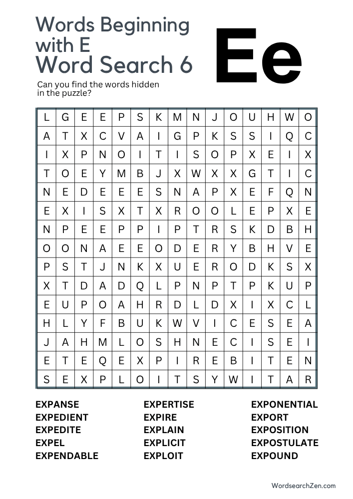 This word search puzzle focuses on words that begin with the letter “E.” It includes a diverse range of terms, such as “elastic,” “emotional,” and “entertain,” challenging players to find and circle them within the grid. The puzzle is designed to engage the mind while providing a relaxing activity, suitable for word search enthusiasts looking for a themed challenge. Ideal for those who enjoy expanding their vocabulary, this puzzle offers a fun and educational way to spend time while discovering new words that start with “E.”