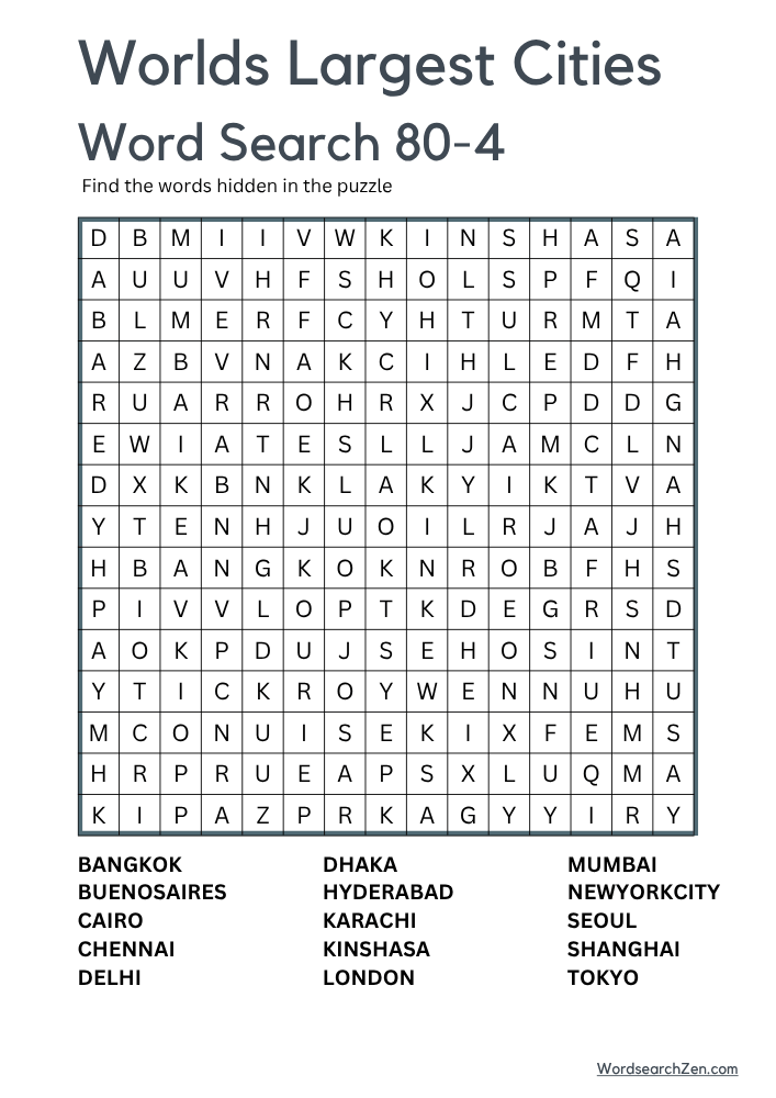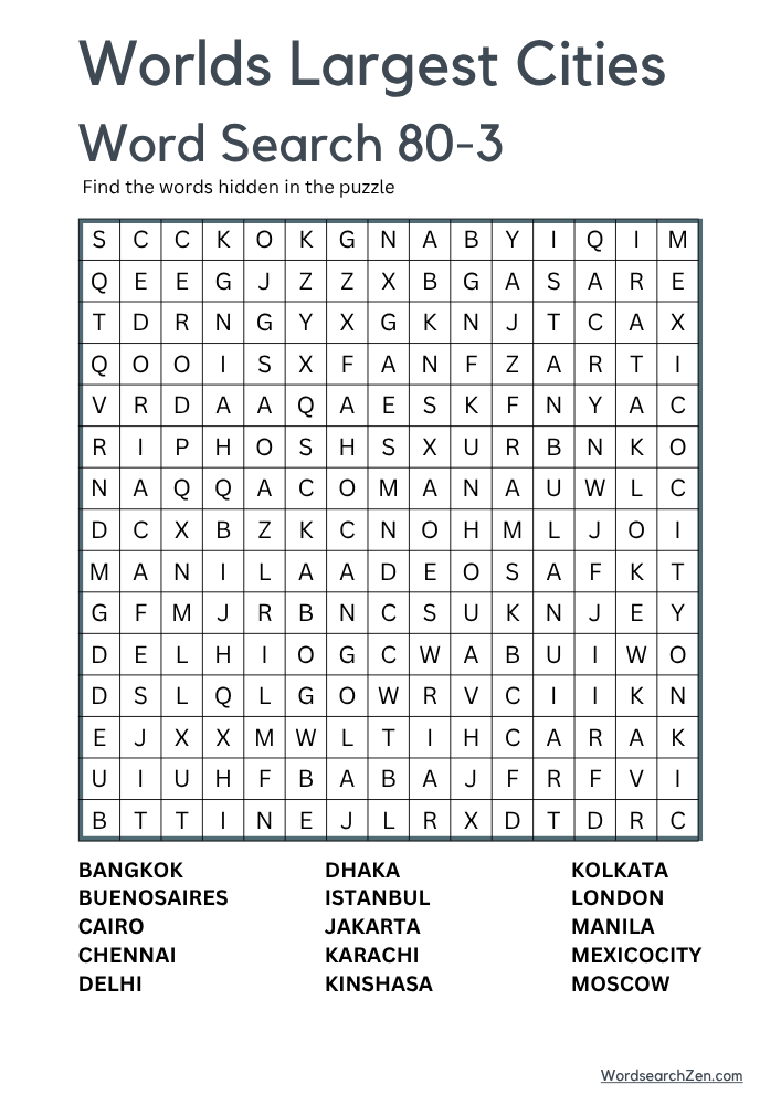 The World’s Largest Cities Word Search 80 offers an engaging way to explore urban giants around the globe. Featuring names of major cities like Tokyo, New York, Rio de Janeiro, Shanghai, and Mumbai, this word search is perfect for those interested in geography and world metropolises. The puzzle can be used in educational settings, travel clubs, or simply as a fun activity to enhance knowledge of international cities and improve problem-solving skills. It’s a great tool for classrooms or personal enrichment.